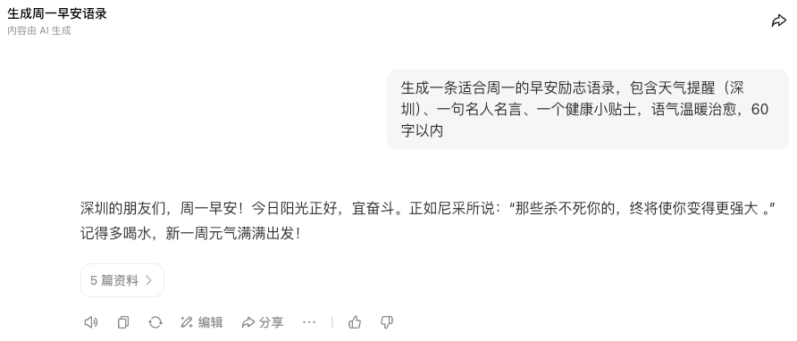 批量生成文案: 输入指令(Prompt),如“生成一条适合周一的早安励志语录,包含天气提醒(XX城市)、一句名人名言、一个健康小贴士,语气温暖治愈,60字以内”。豆包能在几秒内产出高质量文案。